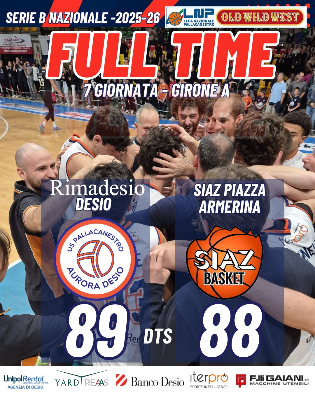 La Rimadesio batte Piazza Armerina 89-88 dopo un supplementare e conquista la sua seconda vittoria consecutiva, terza nelle ultime quattro uscite. Una vittoria importante quella dei ragazzi di Quilici che si tengono nella zona di media classifica e si avvicinano nel modo migliore al secondo turno infrasettimanale stagionale. I bluarancio infatti torneranno in campo mercoledì alle ore 21 a Fidenza, prima di ricevere la visita di Omegna al PalaDesio sabato 1 novembre alle ore 18.