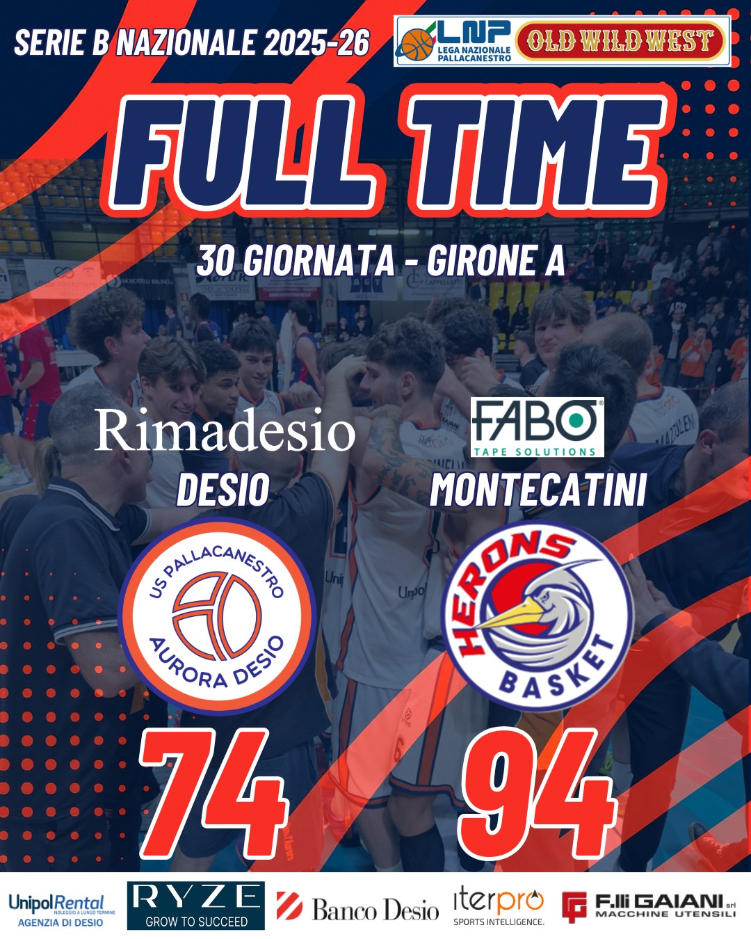 I punti nel pitturato di Chinellato e Tsetserukou lanciano subito la fuga ospite sul 4-13, che diventa 8-18 dopo una tripla di Austikalnis (23 punti, 4/4 da 2 e 5/6 da 3). Desio prova riportarsi sotto grazie ad un gioco da tre punti di Giarelli, un dardo di Conte e due liberi di Bartninkas che fissano il 16-21. Natali apre il secondo quarto da dietro l’arco (16-29) ma l’Aurora non demorde e grazie a due rubate convertite a canestro di Spinelli e Giarelli ed un tiro dalla media di Conte prova a rimanere a contatto. Due triple di Aukstikalnis ridanno ossigeno agli ospiti (24-35) con i padroni di casa che però non stanno a guardare iniziando a mettere punti a referto grazie a Bartninkas ed Elli. Una schiacciata di Tarallo vale il 36-42 del 18′ ma a cavallo dei due quarti centrali Herons confeziona il break di 0-12 ispirato da Chinellato, Tsetserukou e Aukstikalnis che segna la partita sul 36-54. Spinelli (19 punti) con sette punti filati prova a rimettere nella partita i suoi sul 47-60, ma sono le triple di Natali e Sgobba a fissare il 50-69 del 30′, con Montecatini che a fine terzo quarto tira 10/20 da dietro l’arco contro il 3/17 desiano. Nel quarto finale Desio non è ha e sostanzialmente sono 10′ di garbage time. Gli ospiti gestiscono senza patemi trovando il massimo vantaggio sul 63-87 che diventa 74-94 finale.