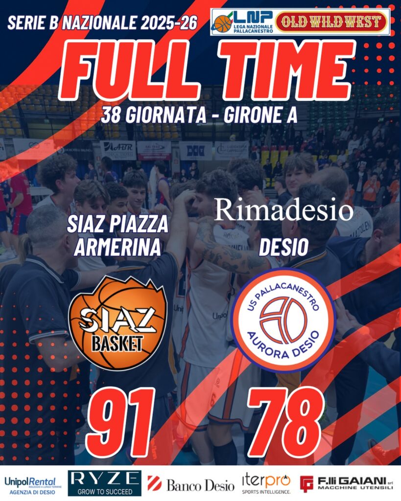 La Rimadesio chiude la propria stagione con una sconfitta (la sesta consecutiva) rimediata per 91-78 sul campo di Piazza Armerina. I ragazzi di Quilici terminano la stagione regolare al 13° posto, facendosi sfuggire proprio all’ultimo l’accesso ai play-in, dopo aver centrato con 5 giornate di anticipo la salvezza diretta, obiettivo di inizio stagione. L’andamento della gara è molto simile alle ultime uscite, con Desio che, complici anche le assenze e le non perfette condizioni di alcuni elementi, fatica a trovare punti dal perimetro, soffrendo poi difensivamente dove le energie fisiche e mentali, dopo una stagione durissima, iniziano a scarseggiare. Dopo 20′ in equilibrio un parziale di 15-0 nel terzo quarto indirizza la gara verso i padroni di casa che comunque nonostante il successo sono costretti ai play-out salvezza vista la concomitante vittoria di Lumezzane sul campo di Assigeco. Per la cronaca anche un successo aurorino non sarebbe servito per centrare i play-in viste le vittorie di Agrigento su Omegna e di Vicenza a Fiorenzuola.